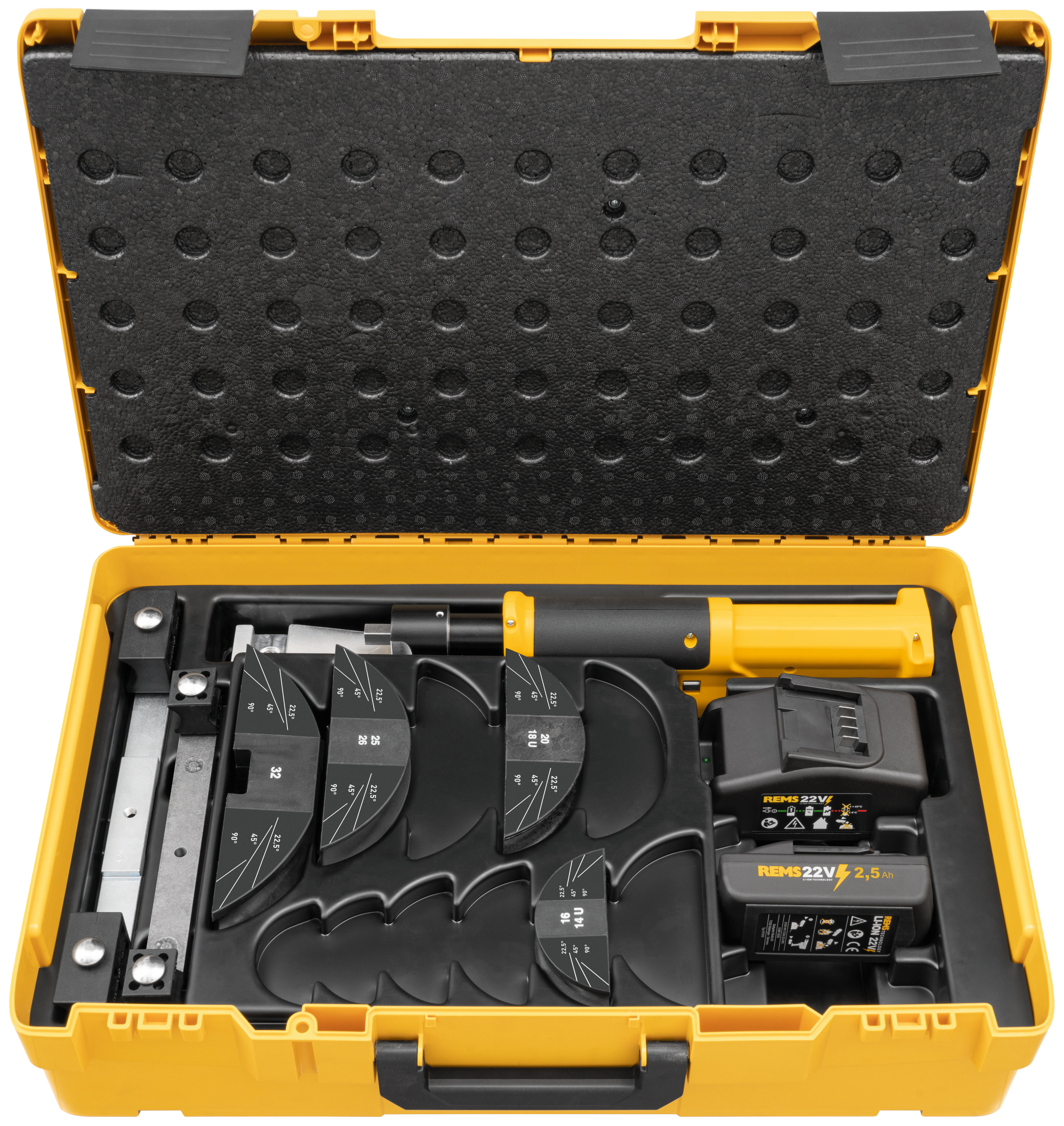 REMS Hydro-Swing 22 V – Rohre dort biegen, wo sie verlegt werden. Mobil, handlich, leicht. Universell für viele Rohrarten einsetzbar. Akku Li-Ion 21,6 V, 1,5 Ah, für ca. 66 Bogen nichtrostendes Stahlrohr der Pressfitting-Systeme Ø 22 mm mit einer Akkuladung.